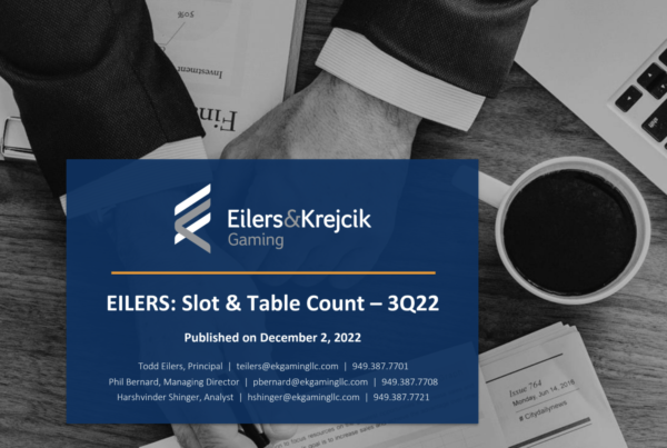 Eilers & Krejcik Gaming 0 December 2, 2022 EILERS: Slot & Table Count – 3Q22 The total U.S. & Canada slot install base increased +1.5% y/y and +0.4% q/q to…Read More