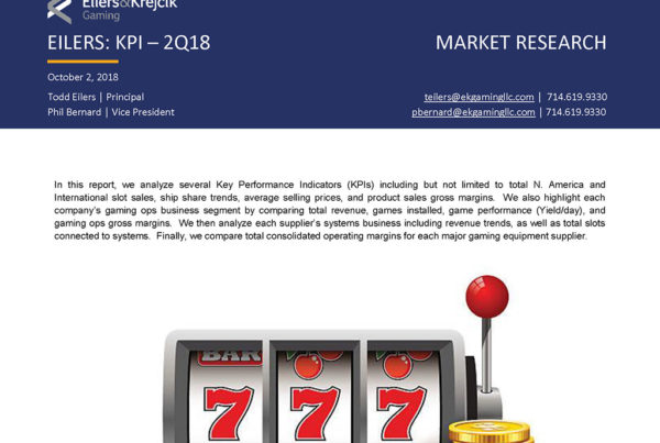 Eilers & Krejcik Gaming 0 October 8, 2018 EILERS: Gaming Supplier KPIs – 2Q18 Quarterly report that includes a summary of total slot machine purchases and games leased by vendor…Read More
