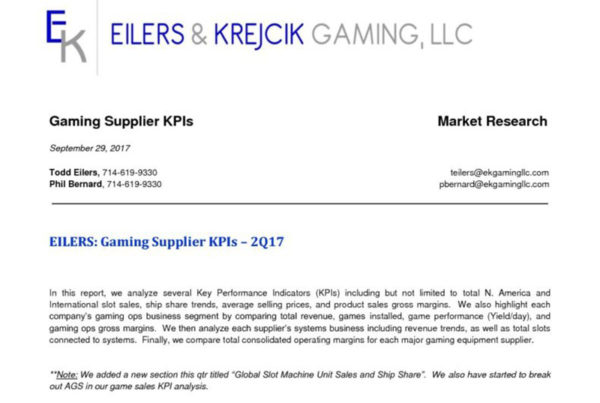 Eilers & Krejcik Gaming 0 September 29, 2017 EILERS: Gaming Supplier KPIs – 2Q17 Quarterly report that includes a summary of total slot machine purchases and games leased by vendor…Read More