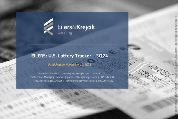 Eilers & Krejcik Gaming 0 November 12, 2024 EILERS: U.S. Lottery Tracker – 3Q24 In 3Q24, total U.S. lottery sales decreased -7% y/y and -3% q/q to $26.2 billion…Read More